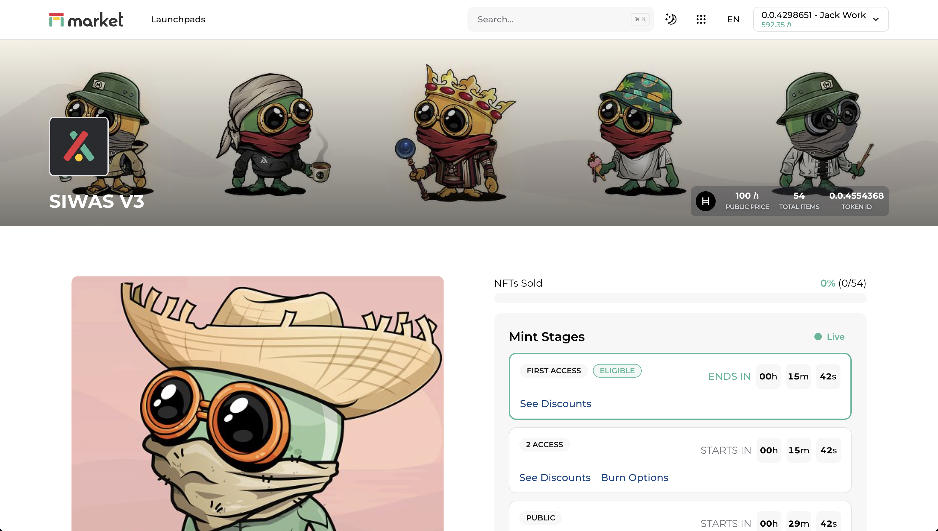 Disponible. Aquí puedes acceder a todos los Launchpads actualmente activos. Haz clic en el Launchpad en el que deseas mintear NFTs y continúa con el proceso.