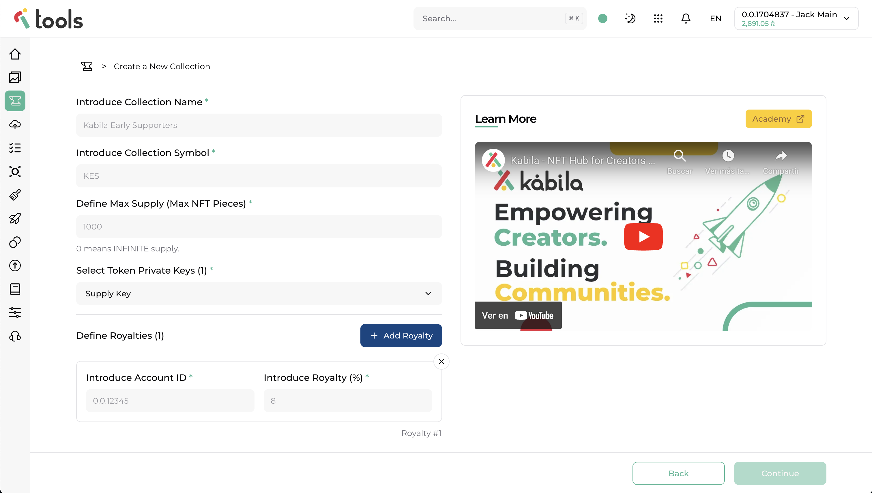 * **Claves Privadas\***. Las Claves del Token te darán control sobre tu Colección. ¡Pero ten en cuenta que un gran poder conlleva una gran responsabilidad! Obtén más información sobre las Claves del Token [**aquí**](https://academia.kabila.app/nft-academy/hedera-nfts/llaves-privadas-del-token).