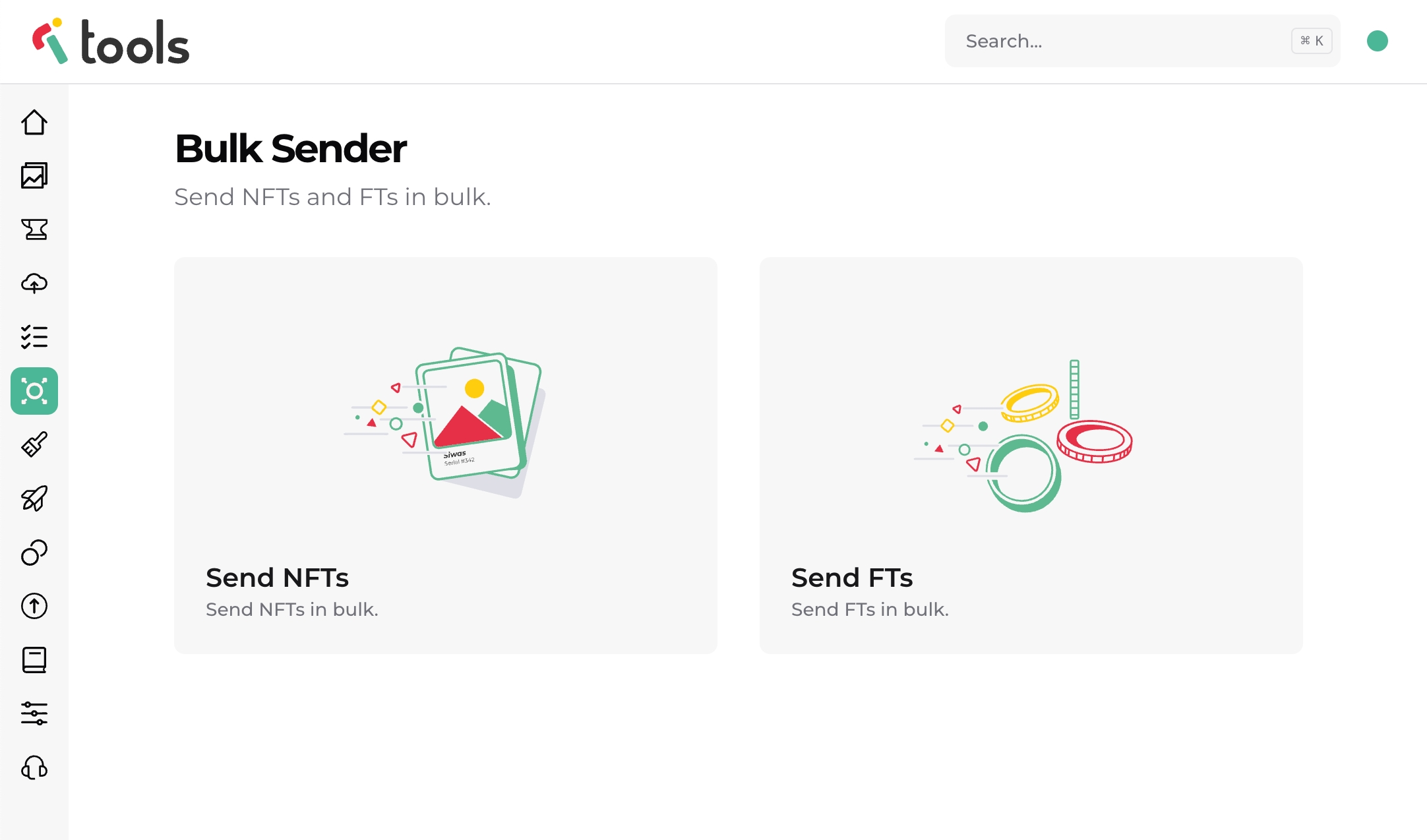 Con la herramienta de Envíos Masivos, puedes enviar masivamente tanto Tokens Fungibles como NFTs a una o varias cuentas.