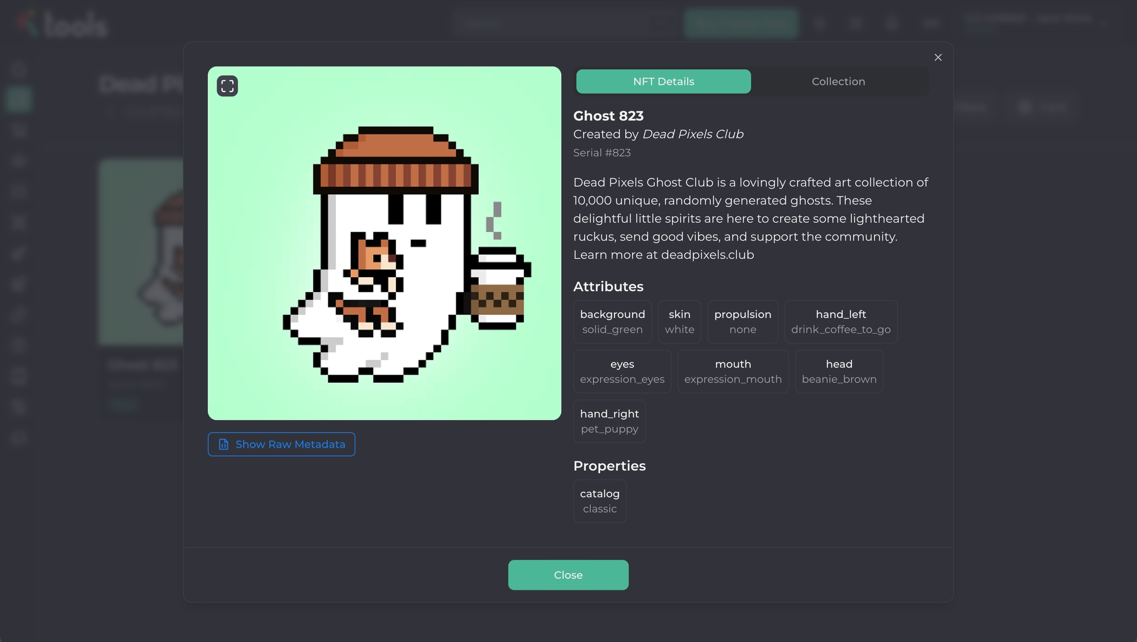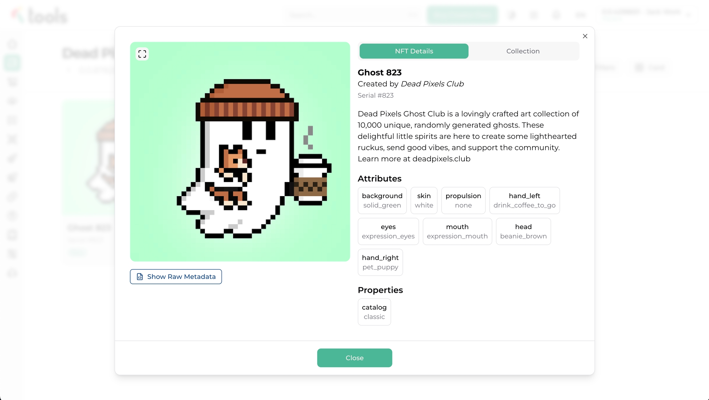Una vez que hagas clic en cualquier NFT, podrás acceder a todos los detalles de los Metadatos de NFT, así como al CID de Metadatos.