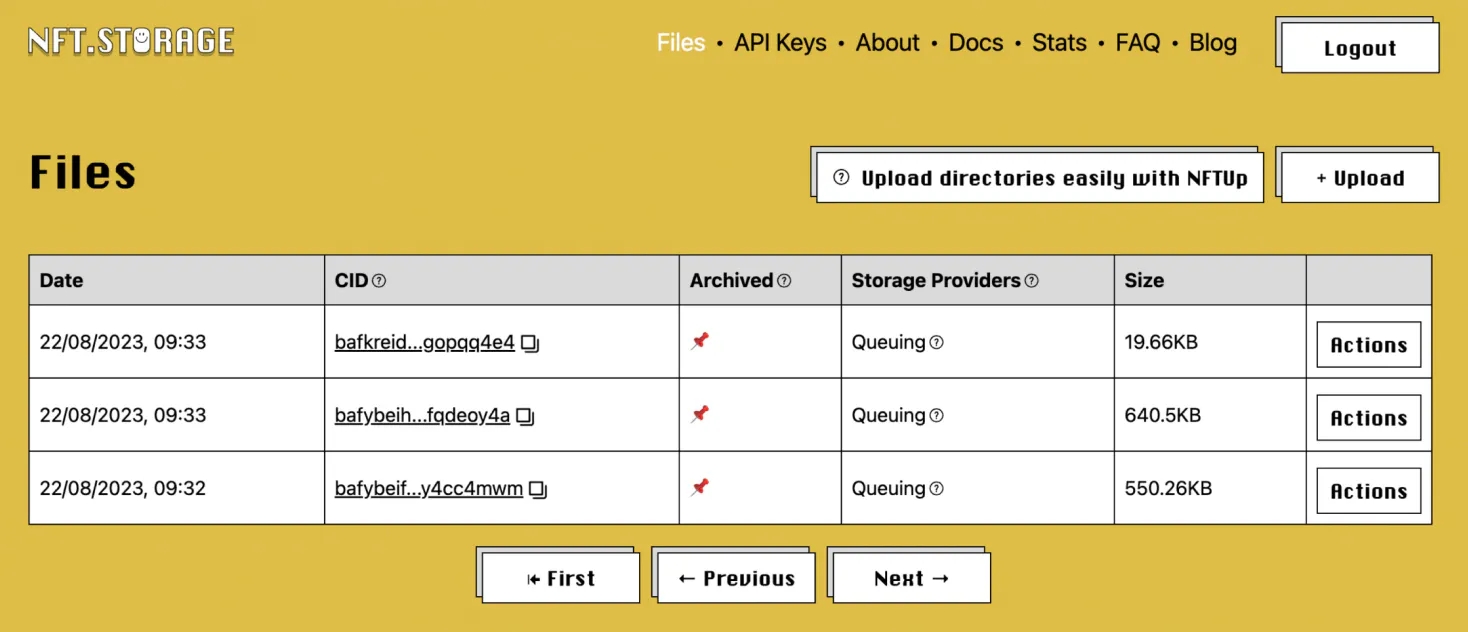 Cuando estén cargados al 100% en IPFS, deberían cambiar de estado de "Queuing" a "Pinned".