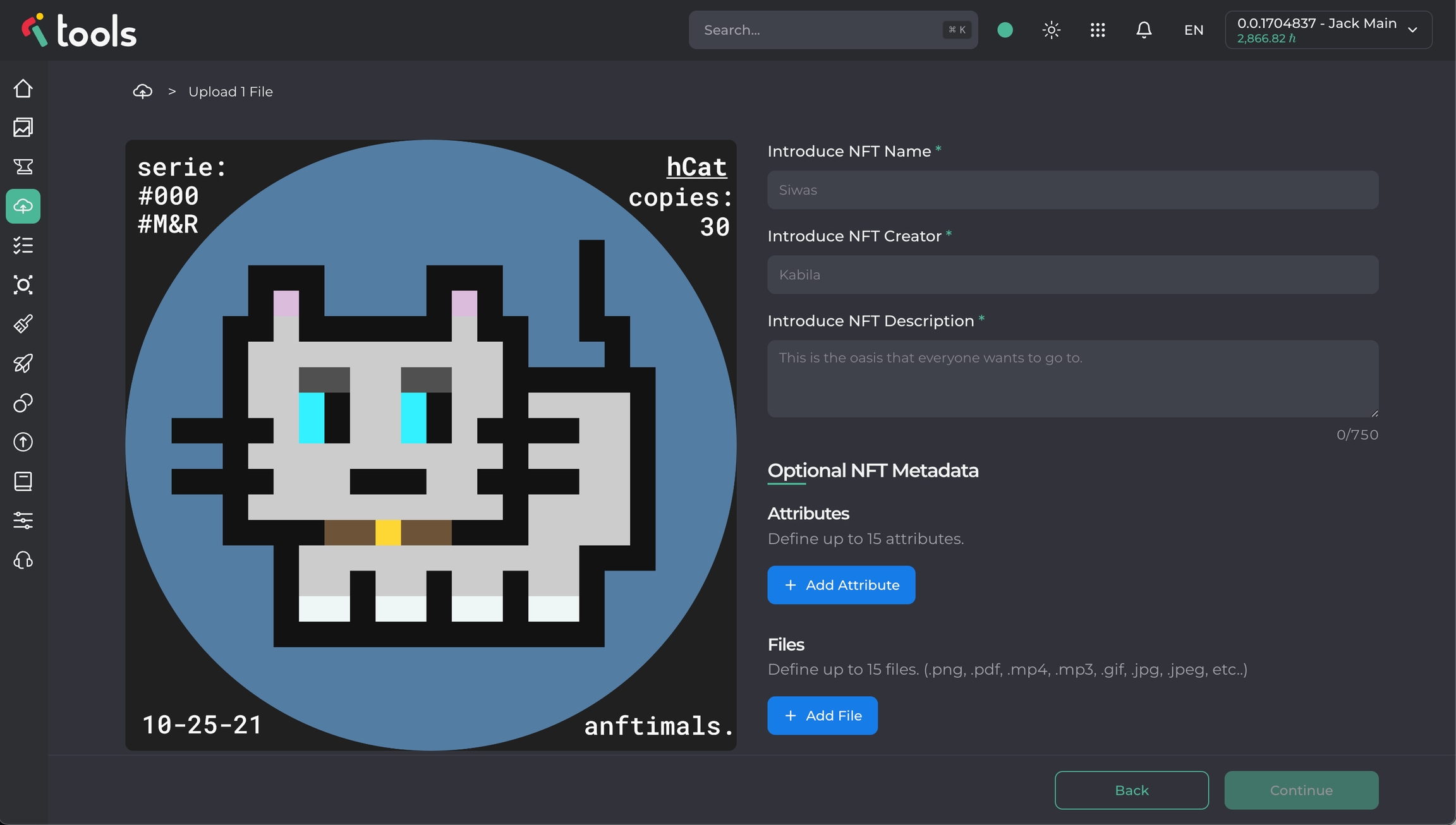 Luego haz clic en Continuar y en unos segundos tus Metadatos NFT se subirán a IPFS, y recibirás tu CID único (Identificador de Contenido).