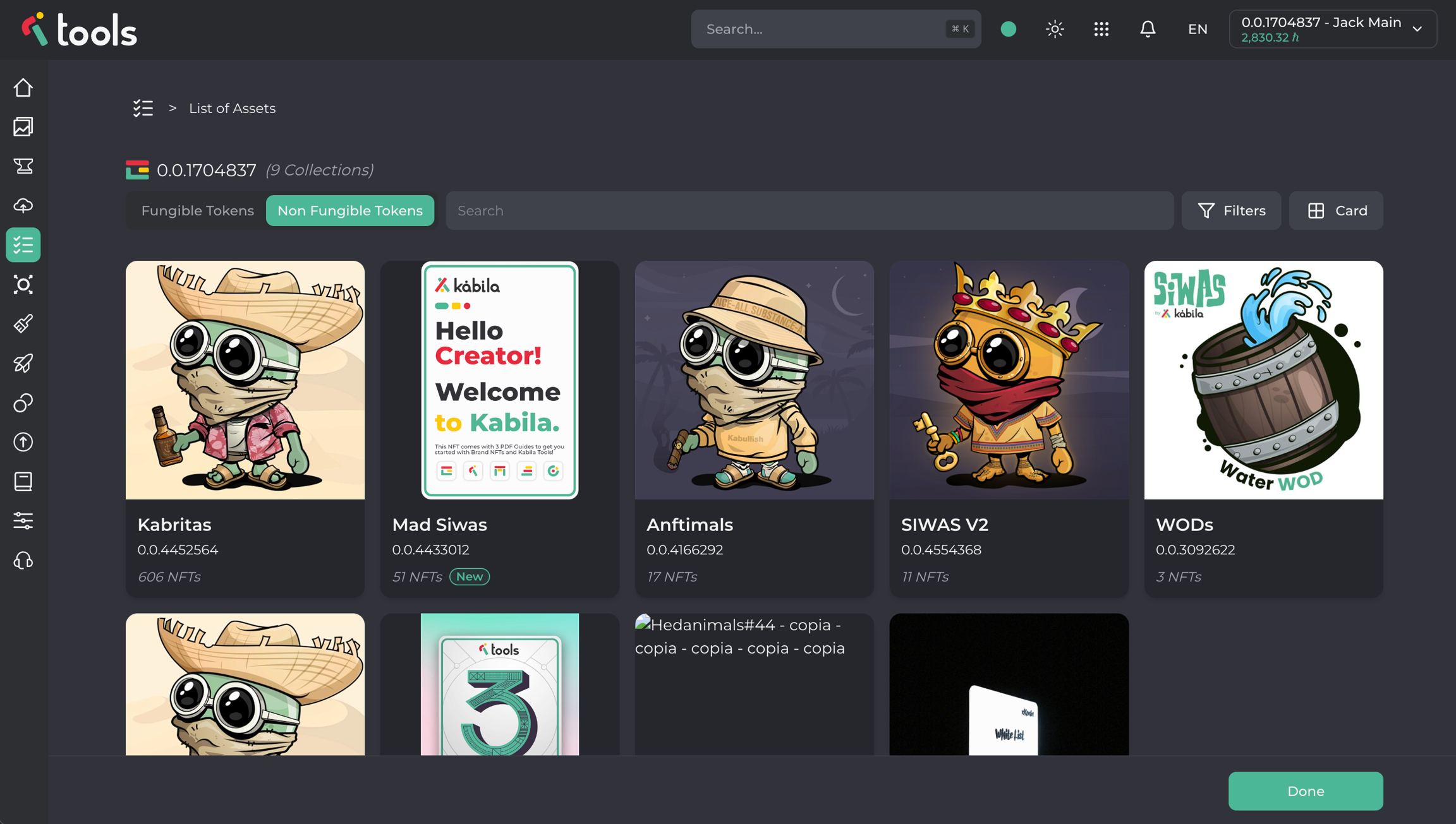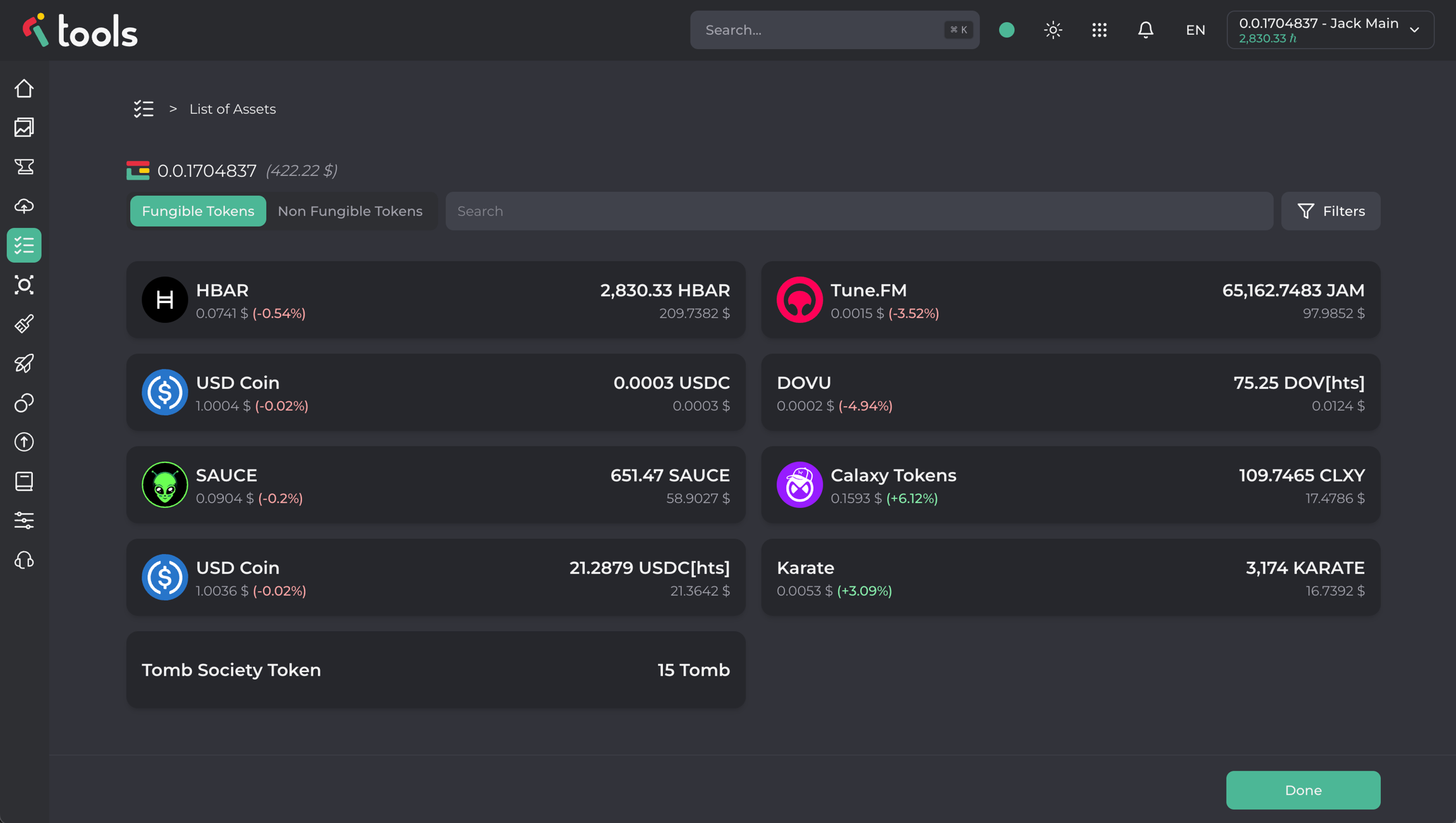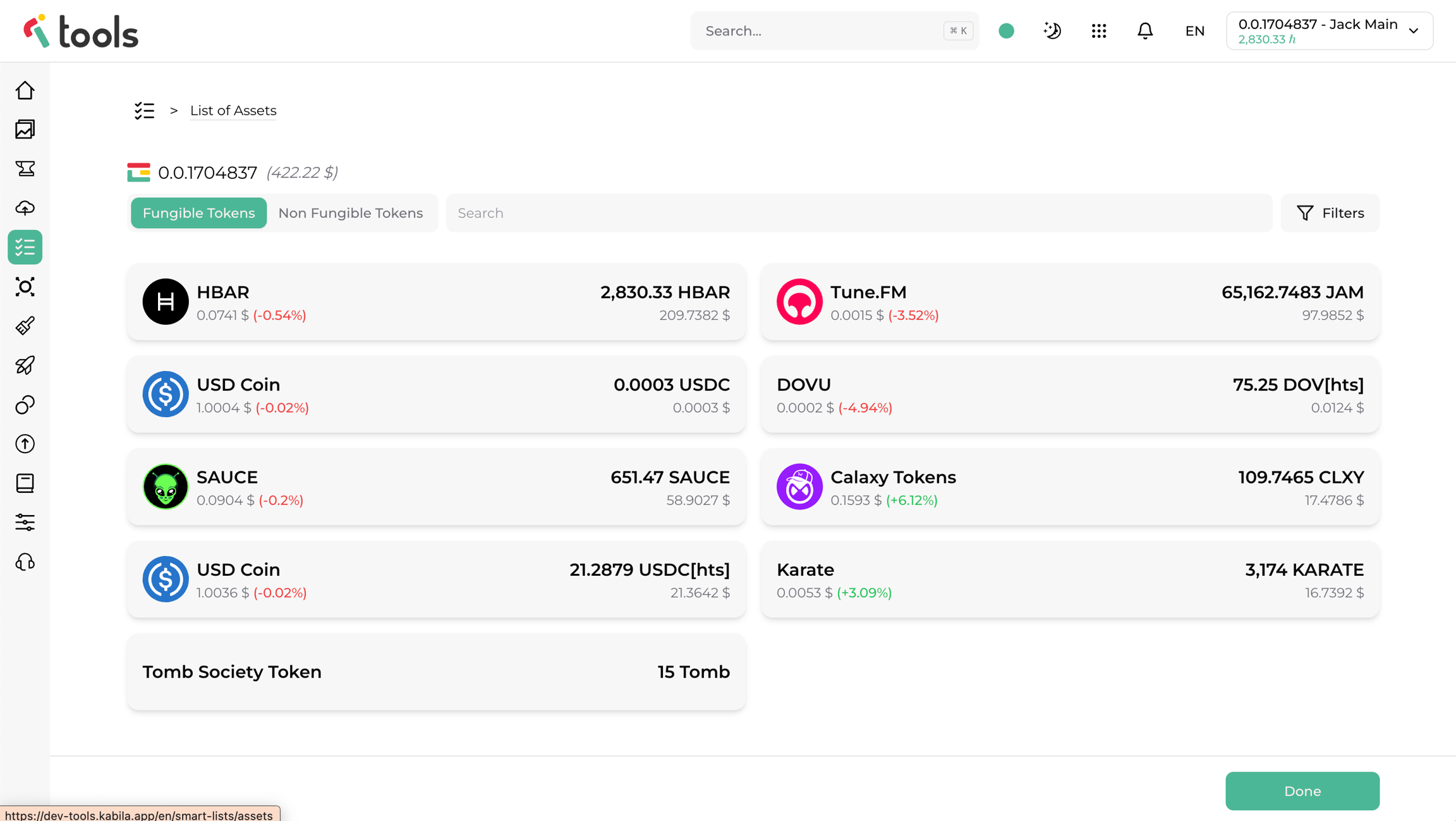 Con la Lista de Activos, puedes verificar rápidamente los activos de cualquier cuenta, tanto sus Tokens Fungibles como sus Tokens No Fungibles.