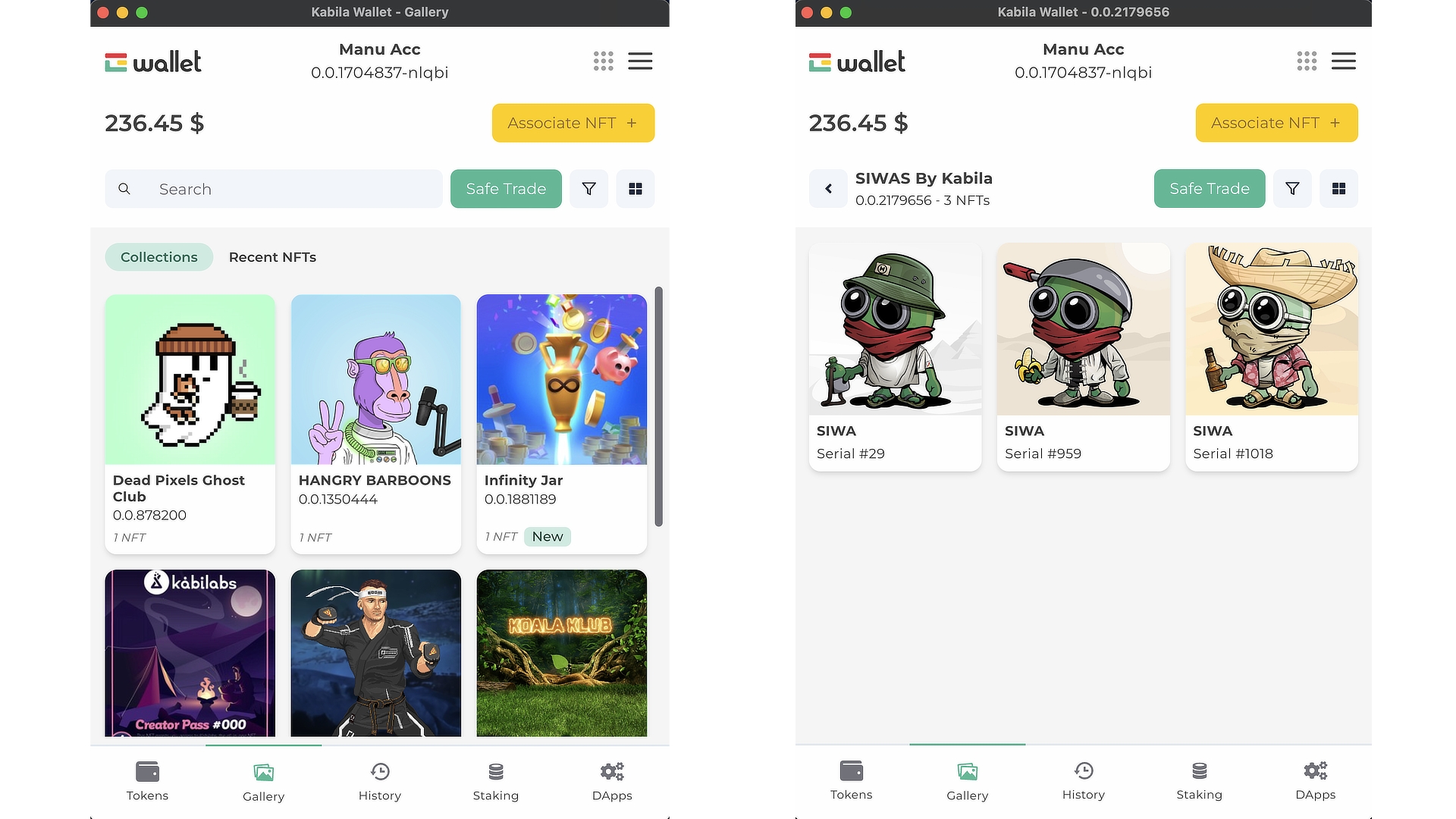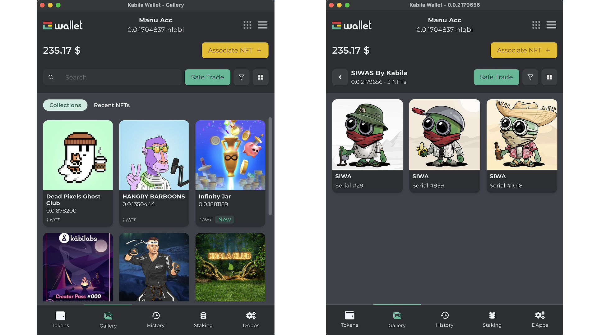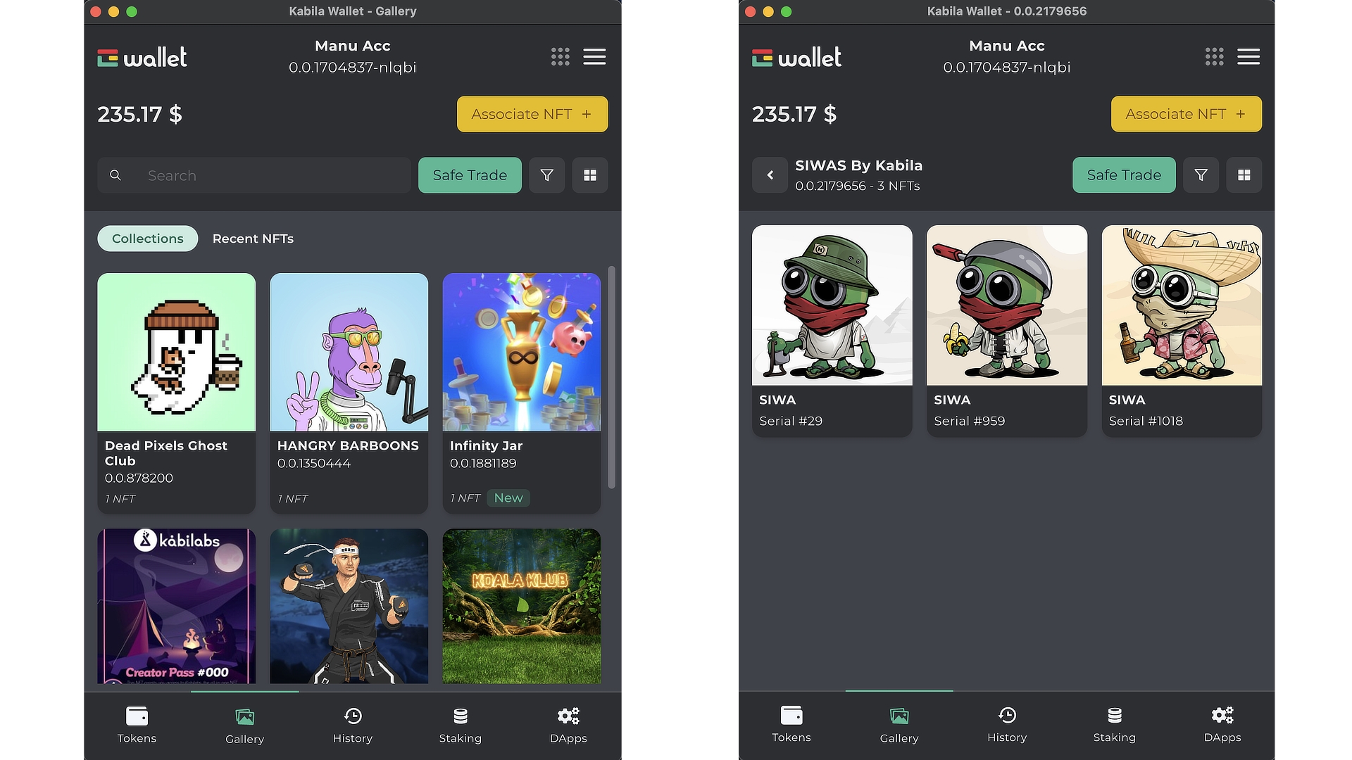 Lo primero que aparece en tu Galería son tus colecciones NFT, junto con sus nombres y Token ID.