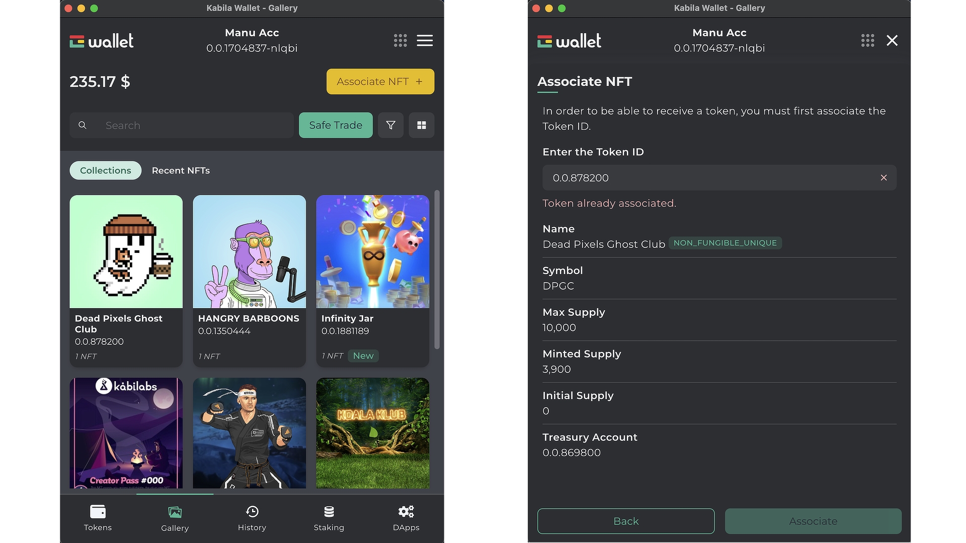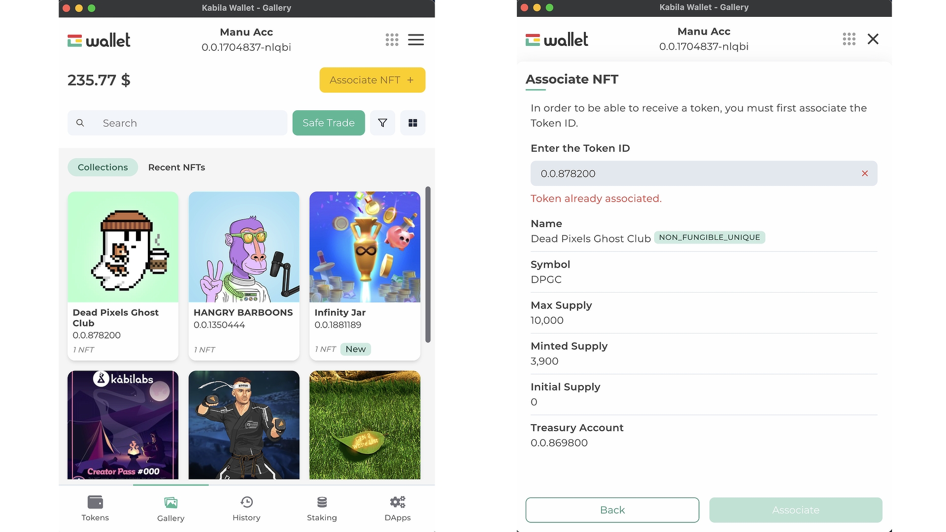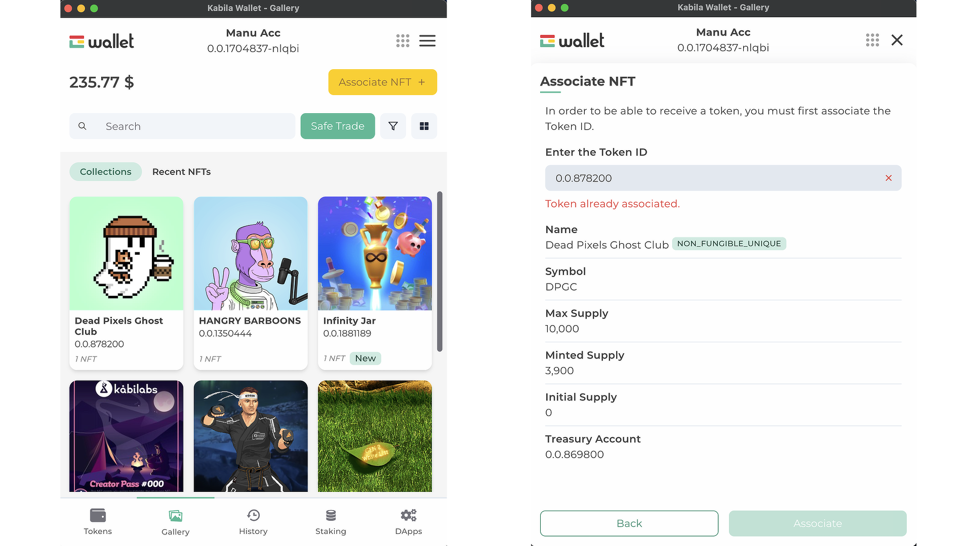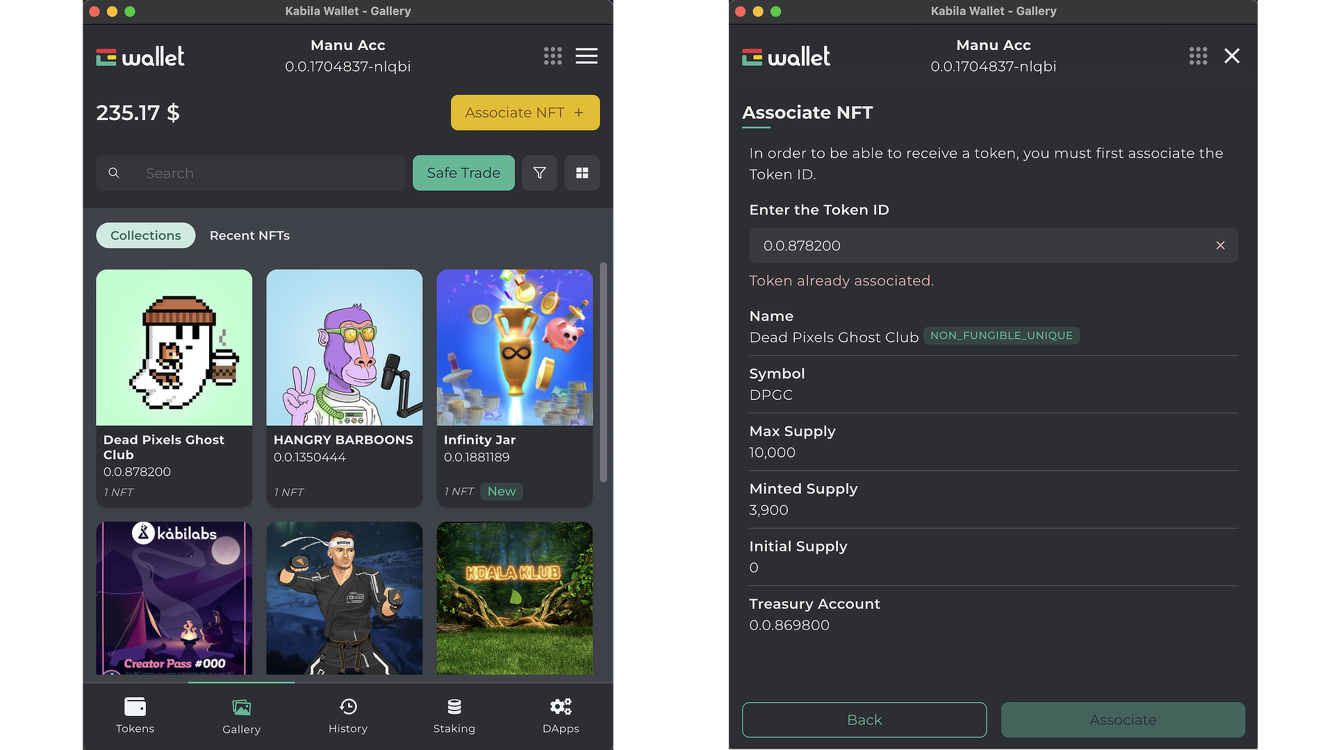 Para asociar un nuevo NFT, ve a "Galería" y haz clic en el botón superior derecho "Asociar NFT".