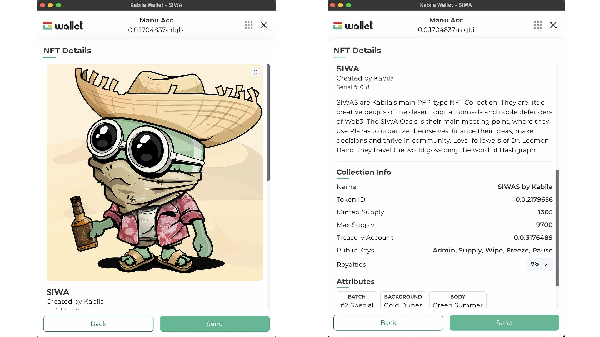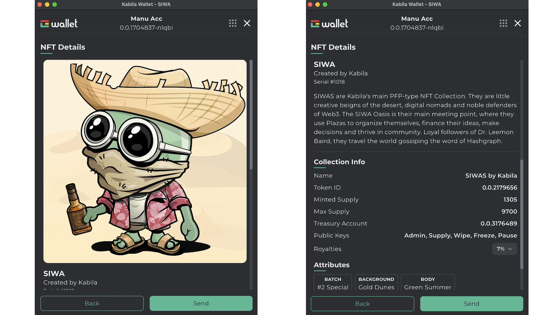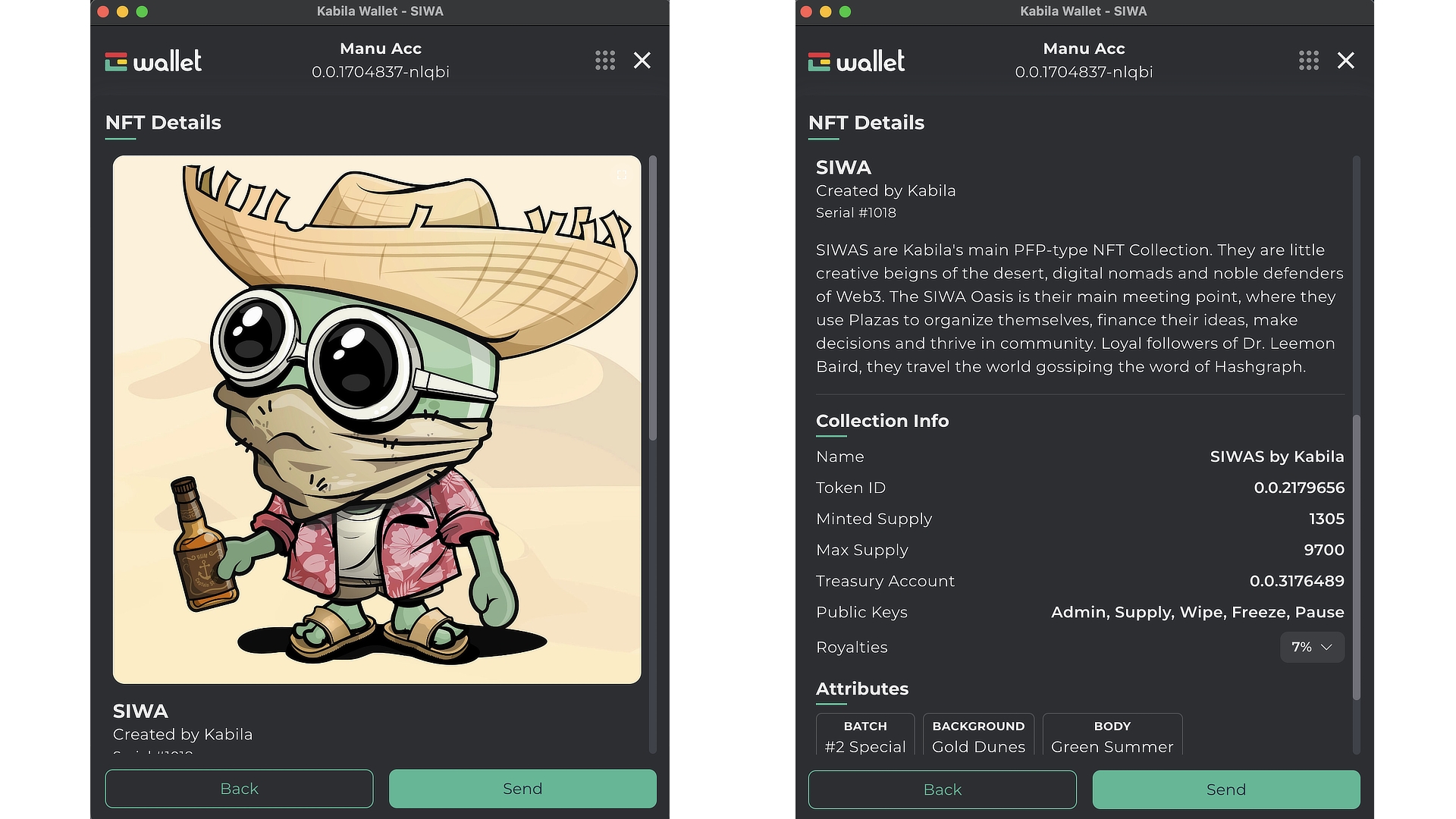 Abre el NFT que deseas enviar, haz clic en el botón "Enviar" en la esquina inferior derecha, agrega la cuenta del destinatario (asegúrate de que el destinatario haya asociado previamente el Token ID de la Colección NFT), ¡y haz clic en Enviar!
