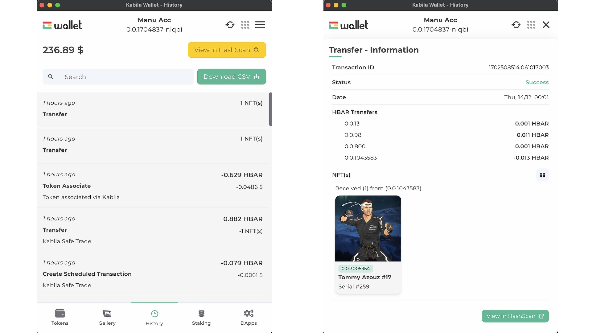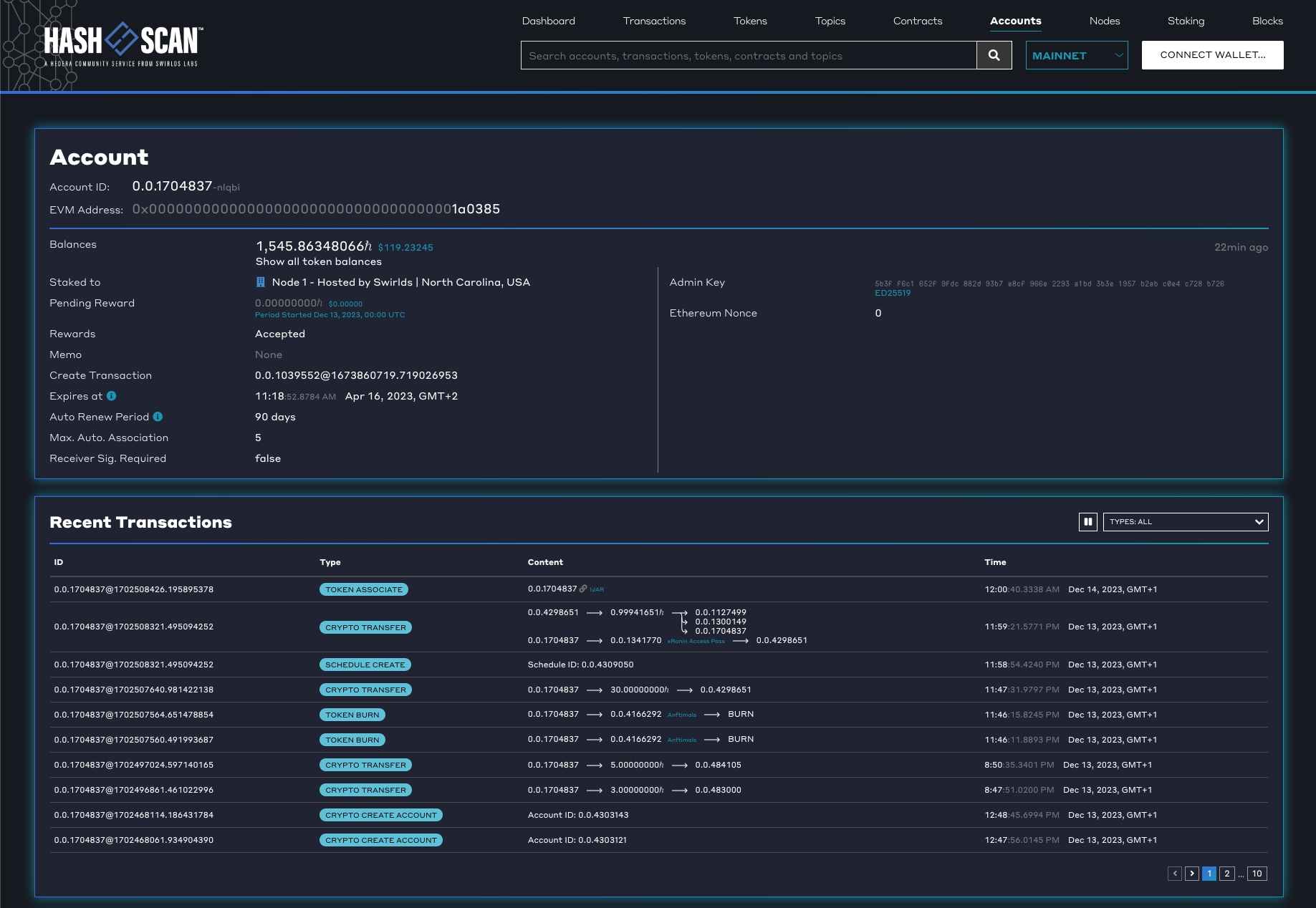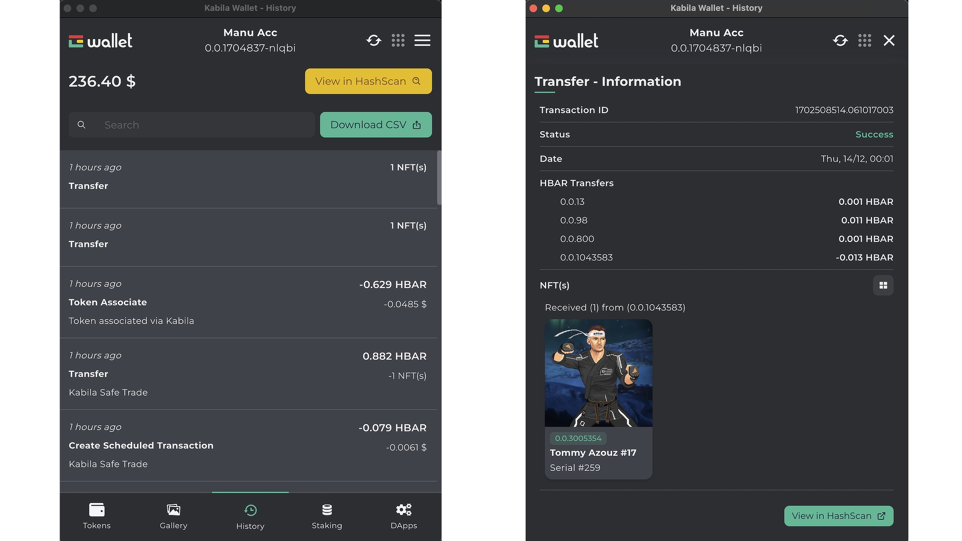Para obtener una visión más detallada de tus transacciones, haz clic en el botón superior derecho "Ver a través de Hashscan" para explorar todos los detalles de la transacción.