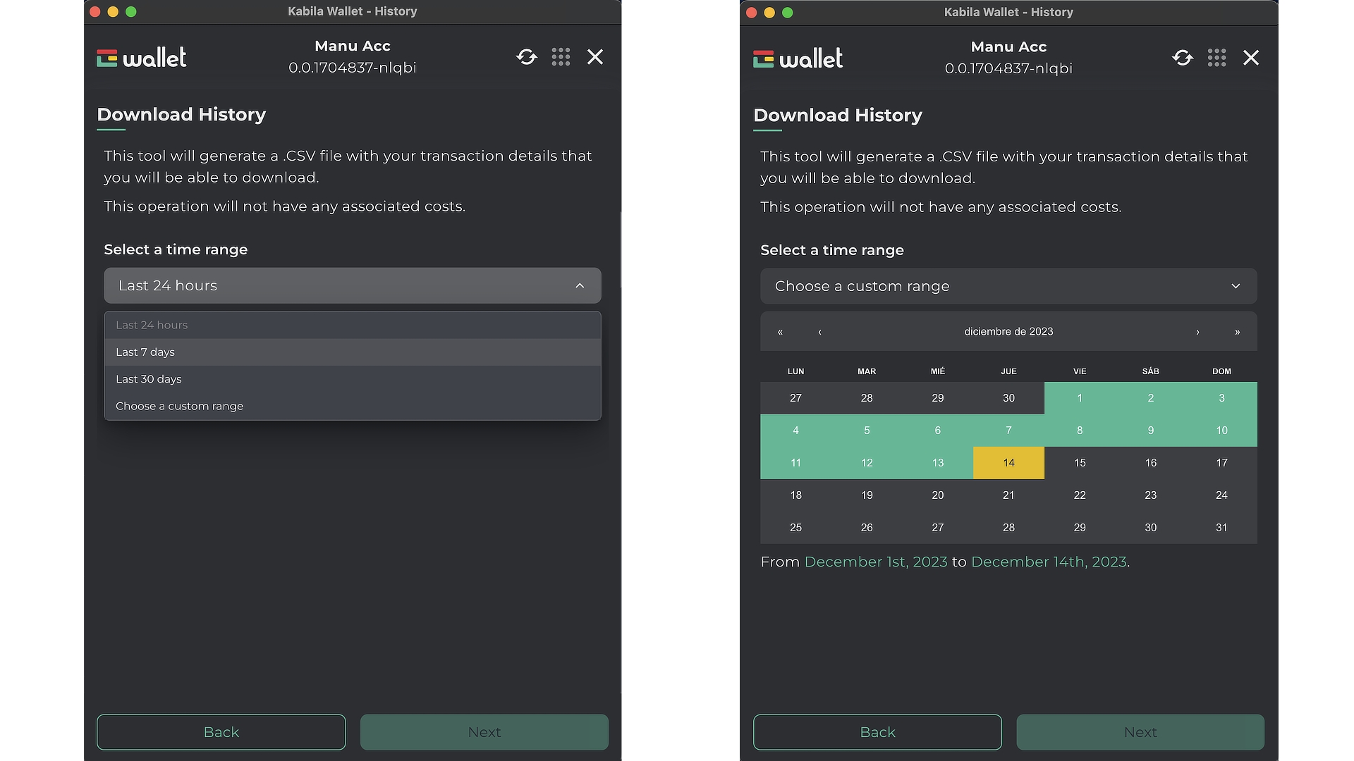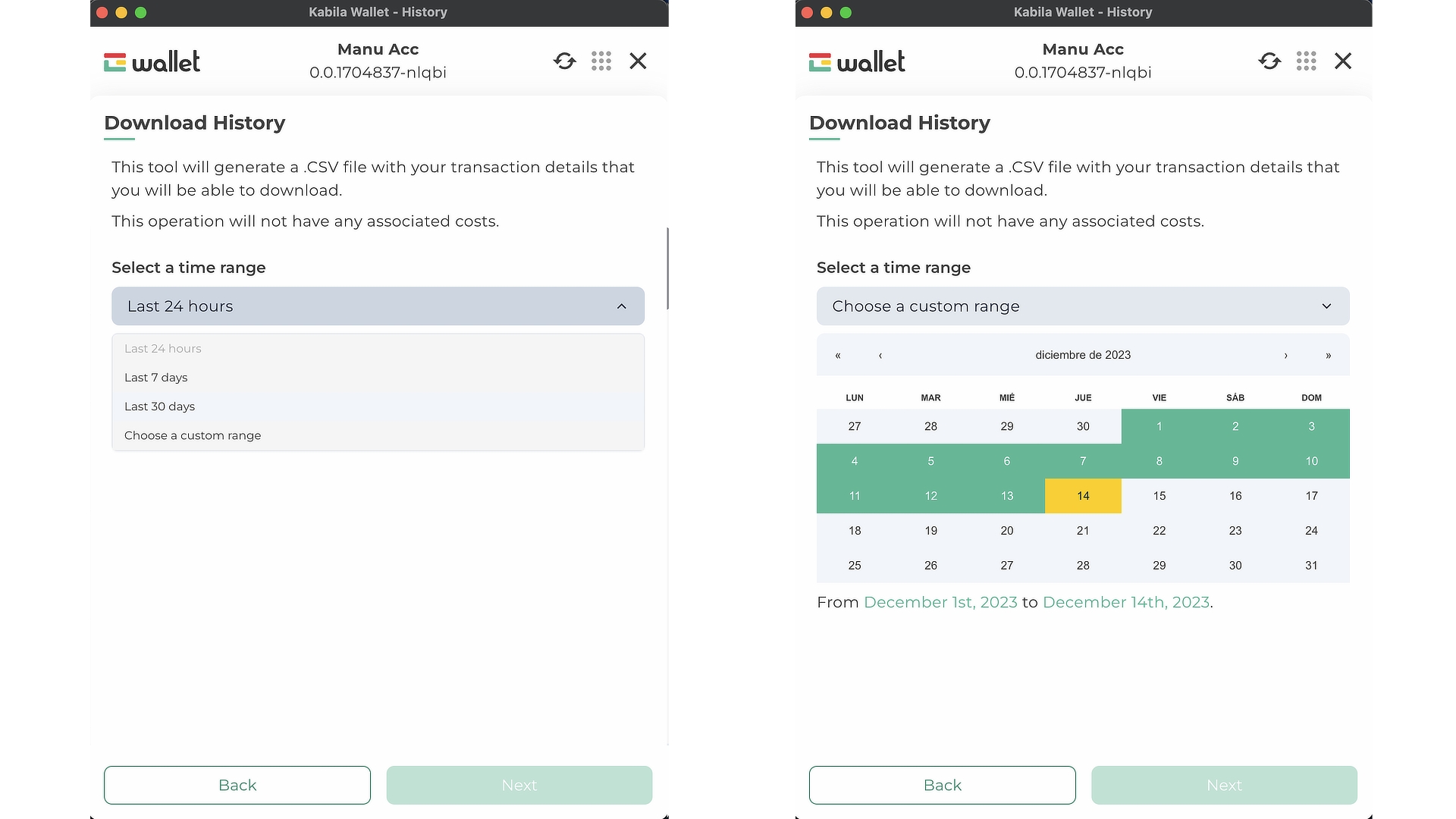 Luego, selecciona el período del cual deseas descargar las transacciones y continúa.