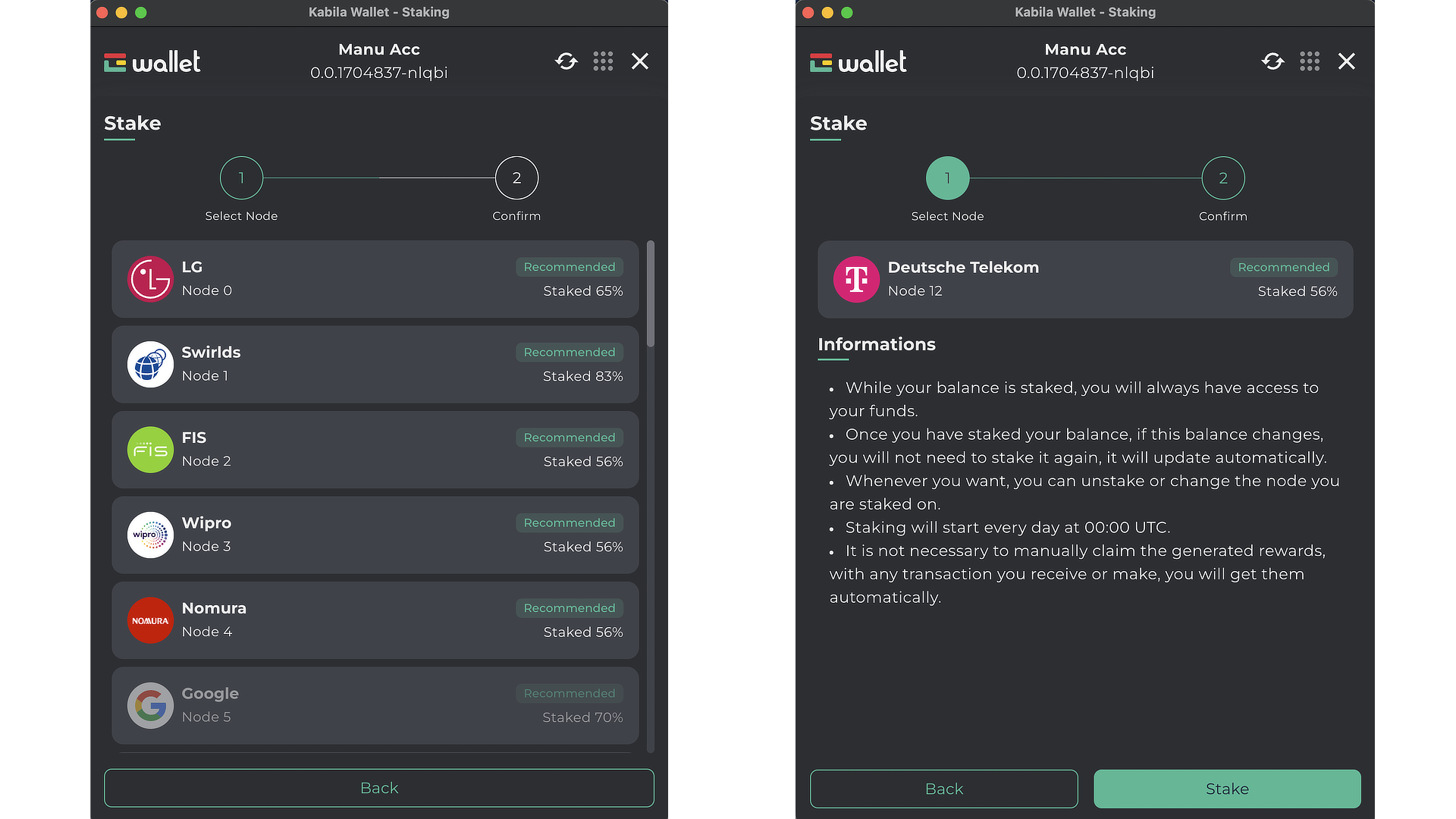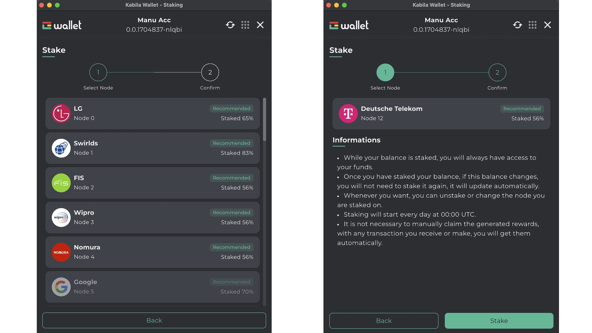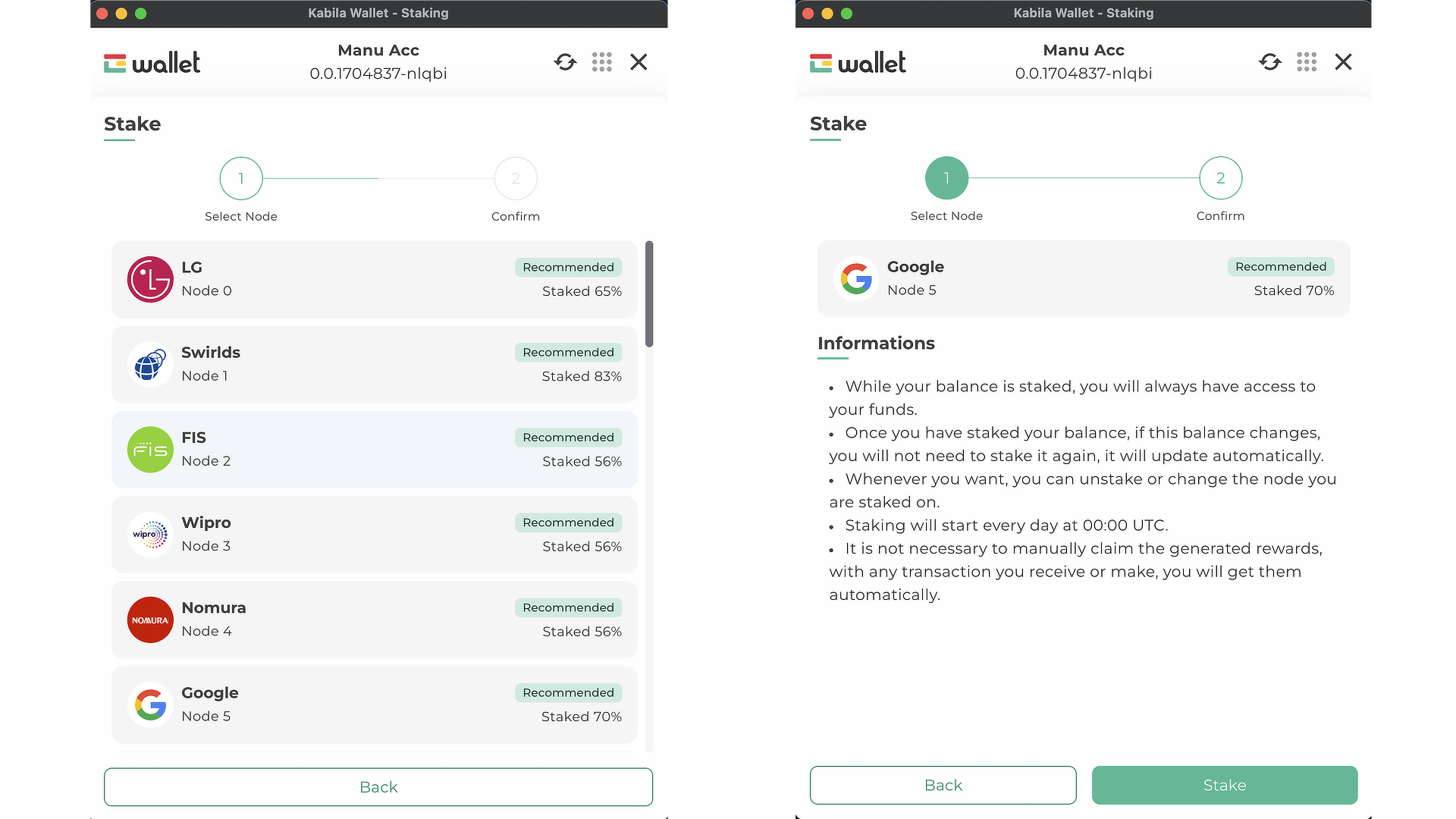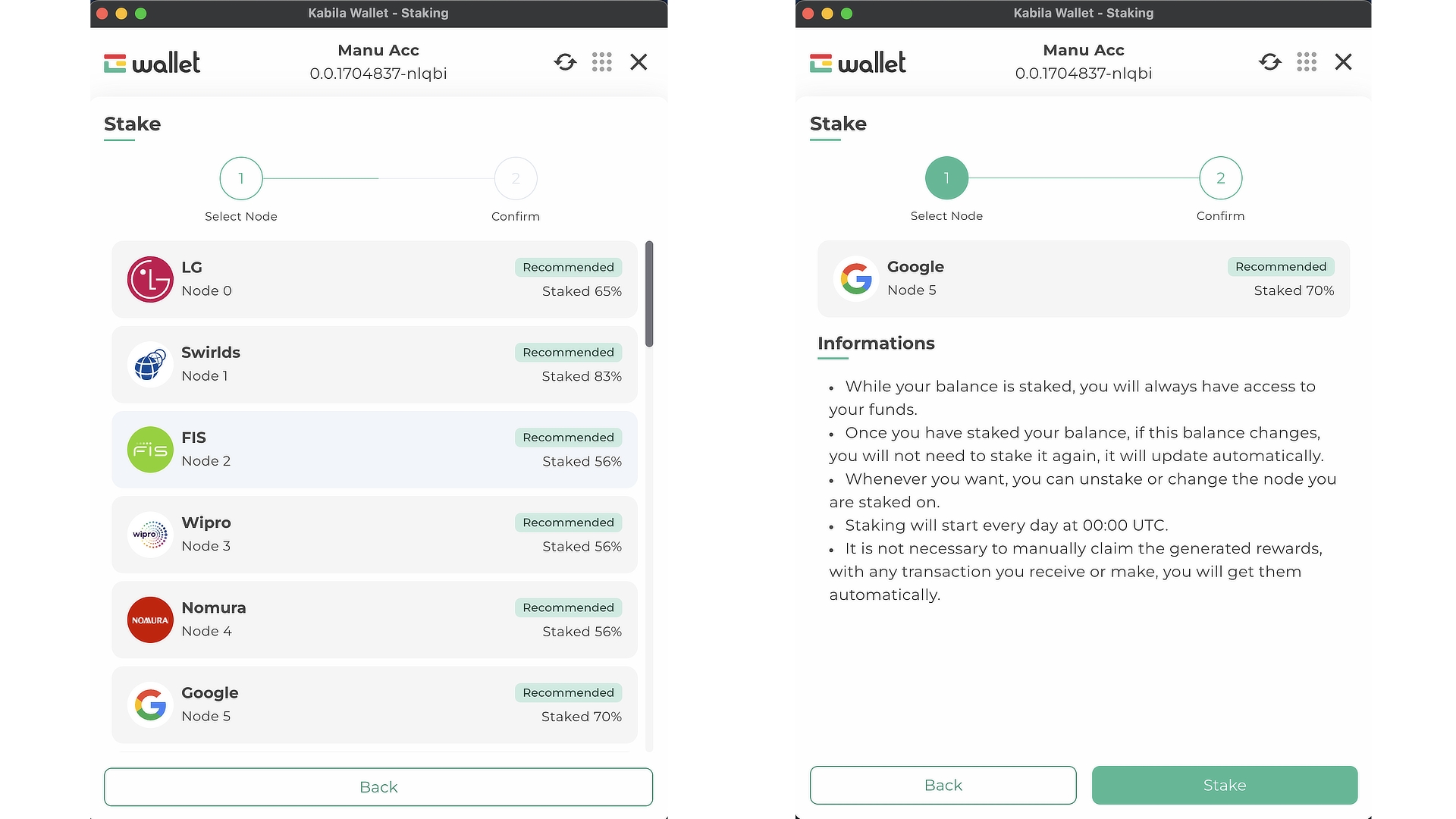 Después de seleccionar un nodo, lee la información y haz clic en "Stake".