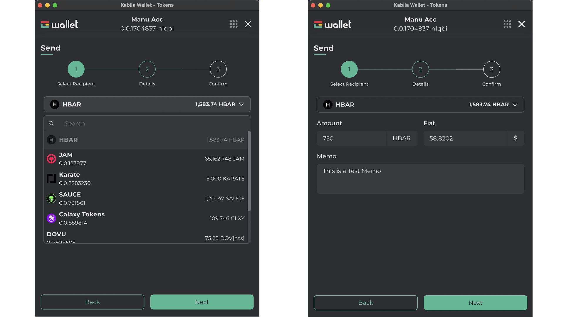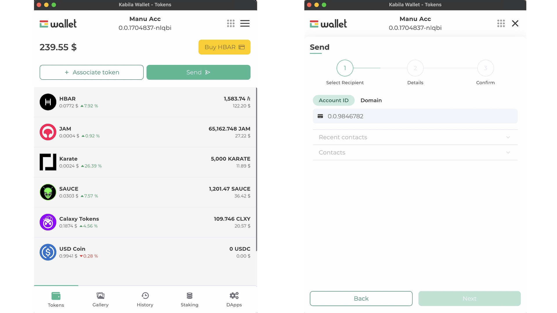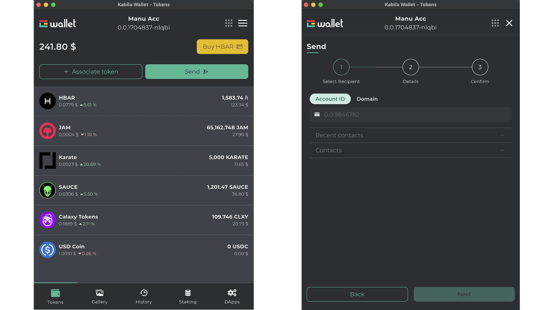 Selecciona el destinatario. En esta sección, deberás ingresar el ID de la cuenta de Hedera al que deseas enviar los fondos y hacer clic en "Siguiente". Ten en cuenta que también puedes enviar fondos a nombres de dominio (como kabila.hbar u otros).