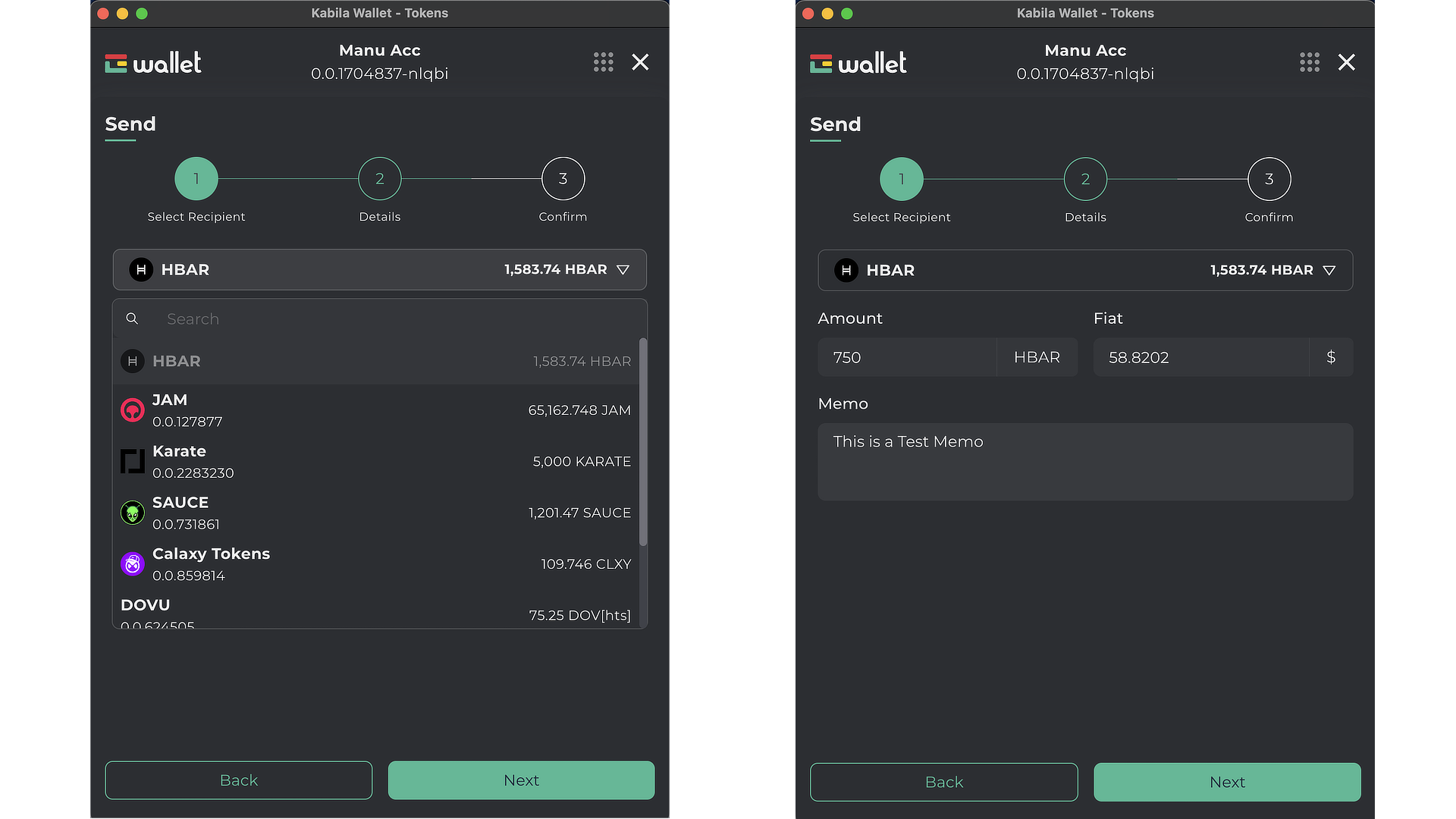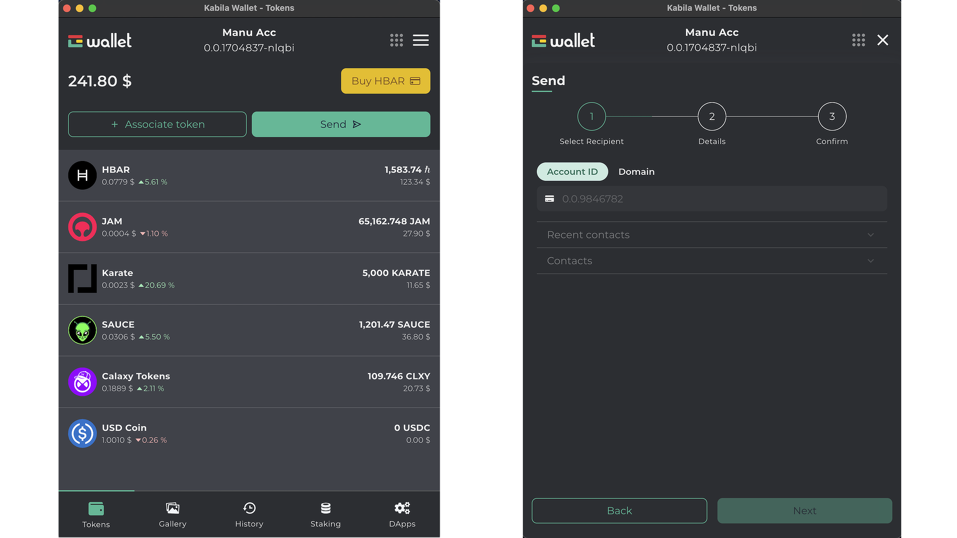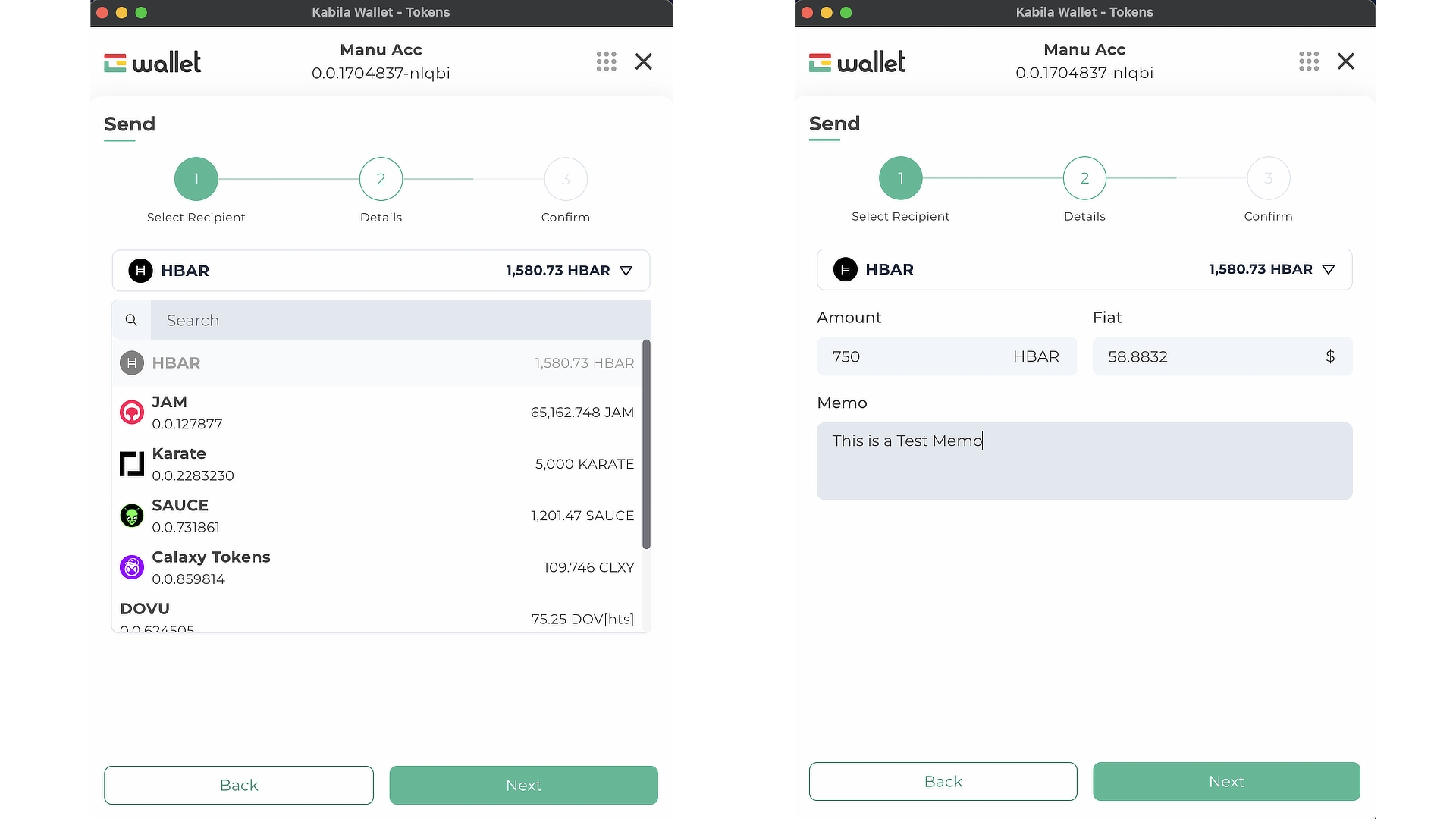 Selecciona el destinatario. En esta sección, deberás ingresar el ID de la cuenta de Hedera al que deseas enviar los fondos y hacer clic en "Siguiente". Ten en cuenta que también puedes enviar fondos a nombres de dominio (como kabila.hbar u otros).