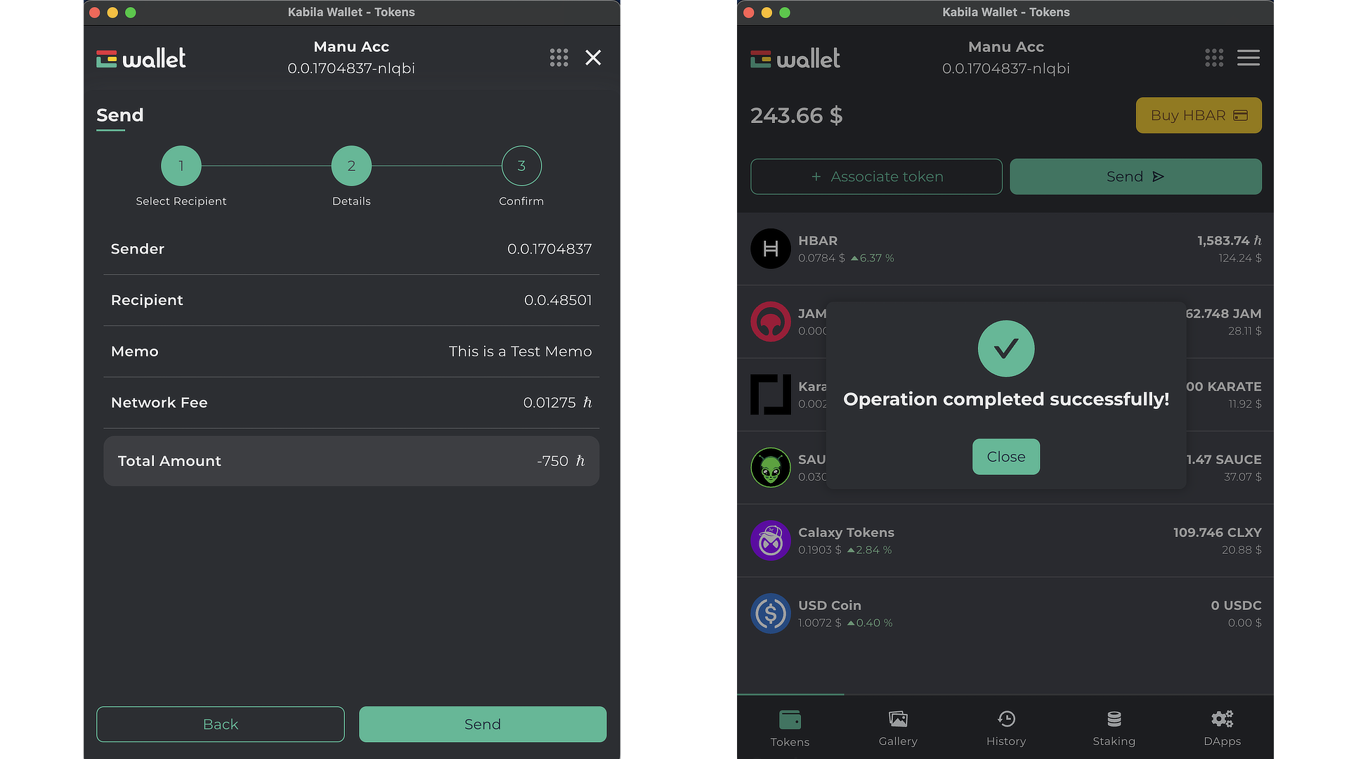 Haz clic en "Enviar". Confirma la transferencia de tokens y espera a que aparezca el mensaje de Éxito.